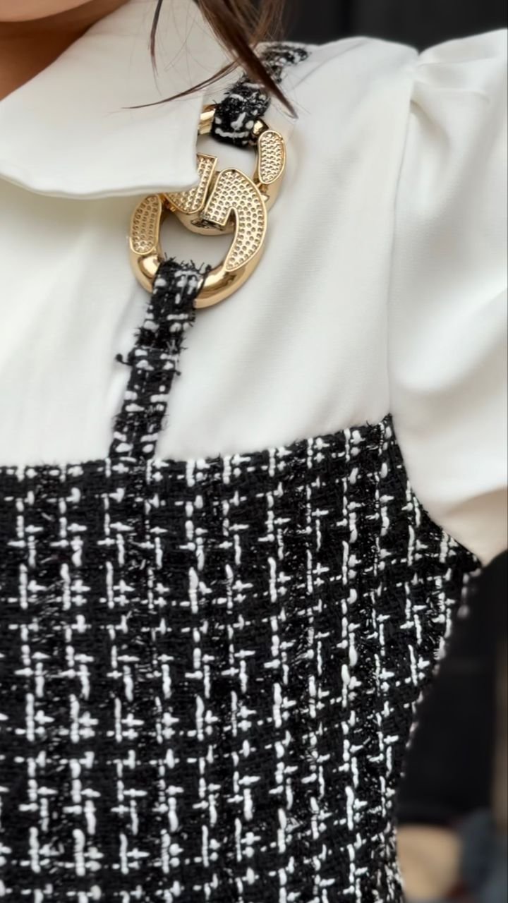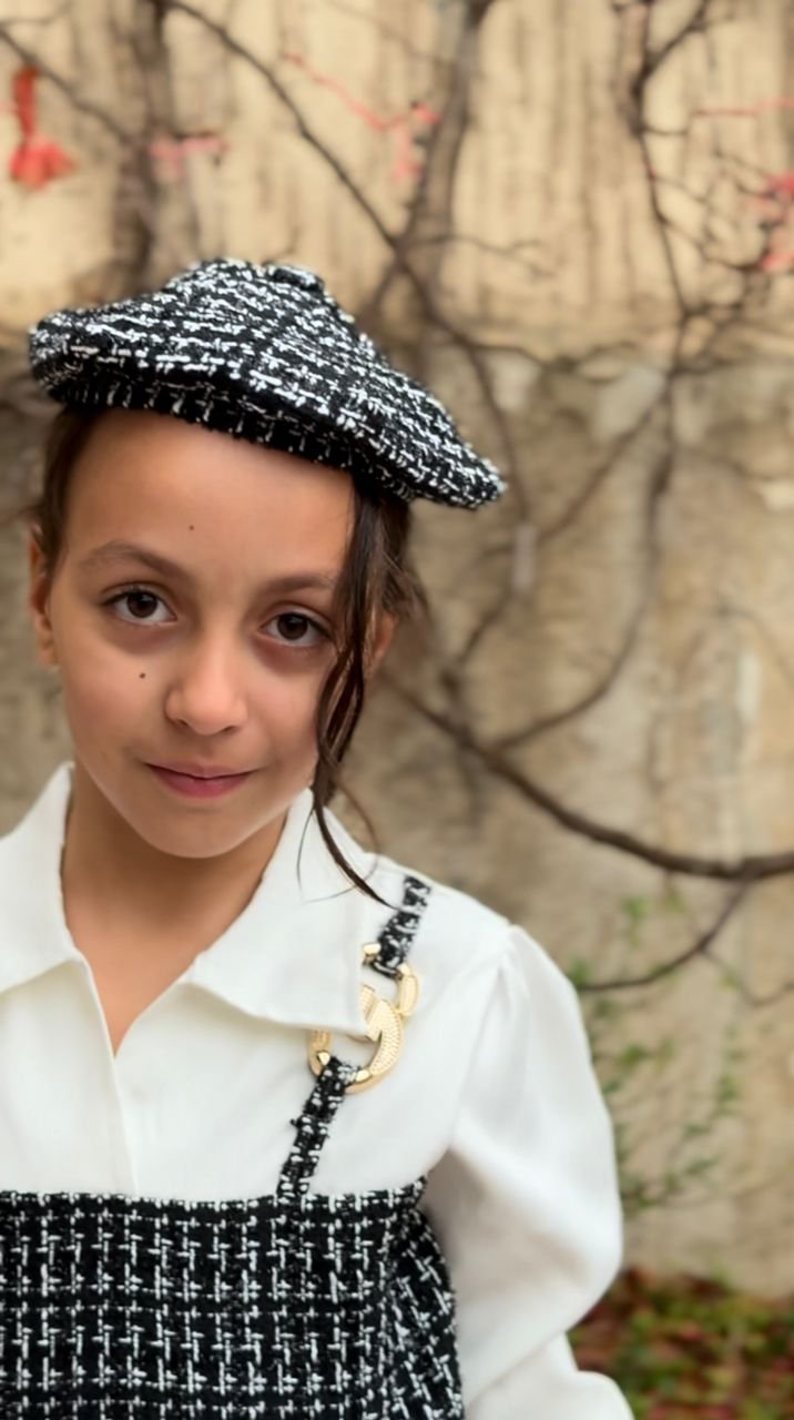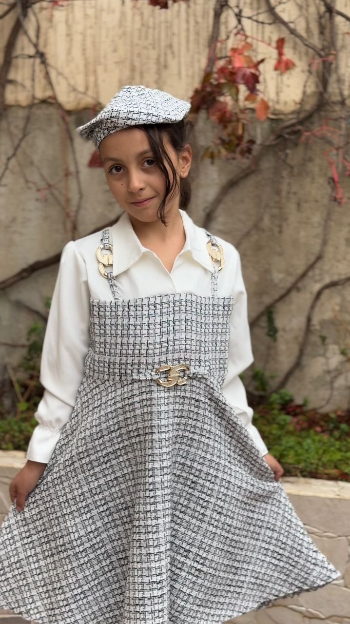 فستان استثنائي بتصميم تويد شانيل الباريسي الراقي، قطعة واحدة متكاملة بأكمام بيضاء أنيقة وتنورة كلوش واسعة. بكلات فاخرة تضفي لمسة ساحرة على إطلالة طفلتك.